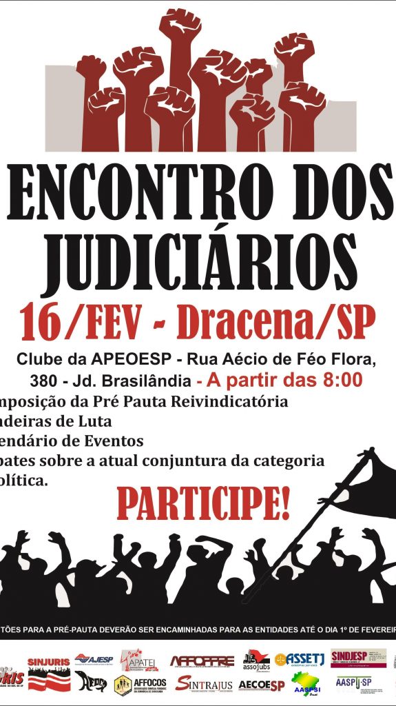 As sugestões para a pré-pauta reivindicatória 2019 e inscrições para o “Encontro dos Judiciários” deverão ser encaminhadas até 1° de fevereiro para o e-mail roque@assojuris.com.br