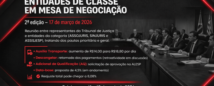 Saiba mais17-Março-2026, terça-feira, estiveram reunidos em Mesa de Negociação, 2ª edição, representantes e membros do Tribunal de Justiça e dirigentes das entidades de classe representativas de servidores, dentre elas a ASSOJURIS, SINJURIS e ASSISJESP, a fim de tratar sobre as pautas prioritária e geral da categoria. A […]